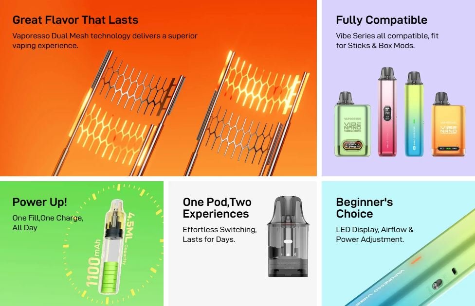 El dispositivo destaca por su larga duración de sabor gracias a la tecnología Dual Mesh, dos experiencias según se desee, por ser compatible con toda la serie Vibe, su carga duradera y por ser la elección perfecta para aquellos que se inician.